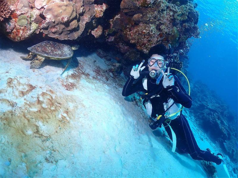 3本目の遊びのダイビングではカメと一緒に記念撮影。