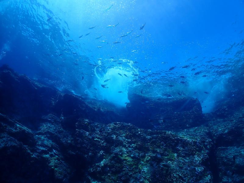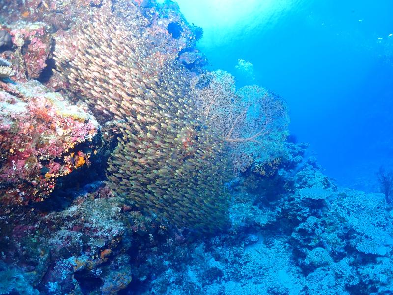 岩陰にびっしりと集まっていたのは、無数のキンメモドキ。透き通る体と大きな目が特徴的で、光を浴びると金色に輝きます。その姿は幻想的で、まるで水中の宝石箱を覗いているよう。ダイバーが近づくと、一斉に向きを変える群れの動きは圧巻で、自然が織りなす芸術を感じさせてくれます。沖縄の海を代表する光景のひとつで、訪れる人々を魅了してやみません。