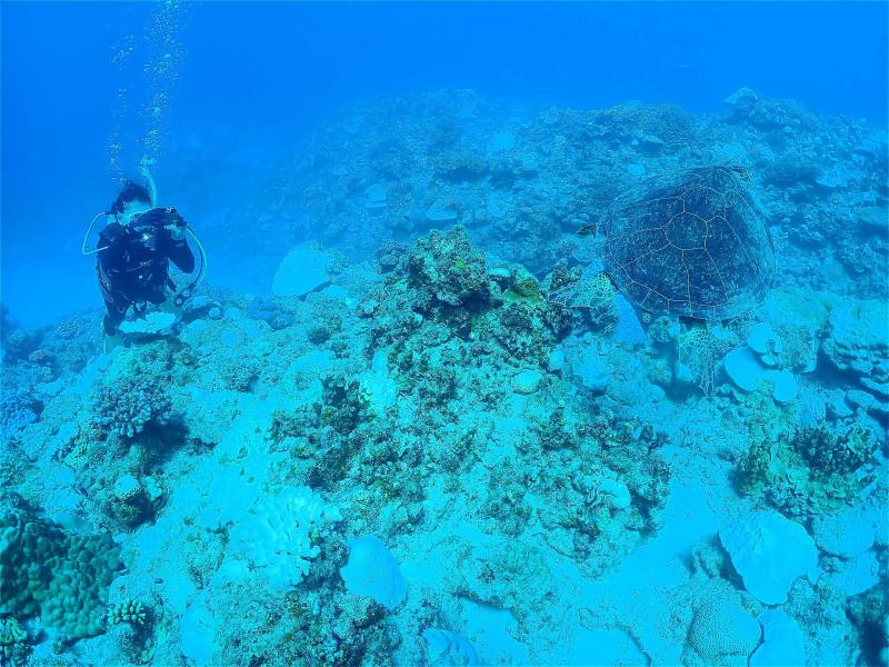 潮が下げた3本目はカメ探し。40分泳いで最後の35分からアオウミガメとタイマイを発見。ボートの半径20m以内にどちらもいました。