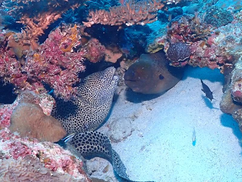 大きなウツボはちょくちょく見ますが、皆同じ個体かと思ってましたが、好きなくても大きなドクウツボは3個体いますね・・・。